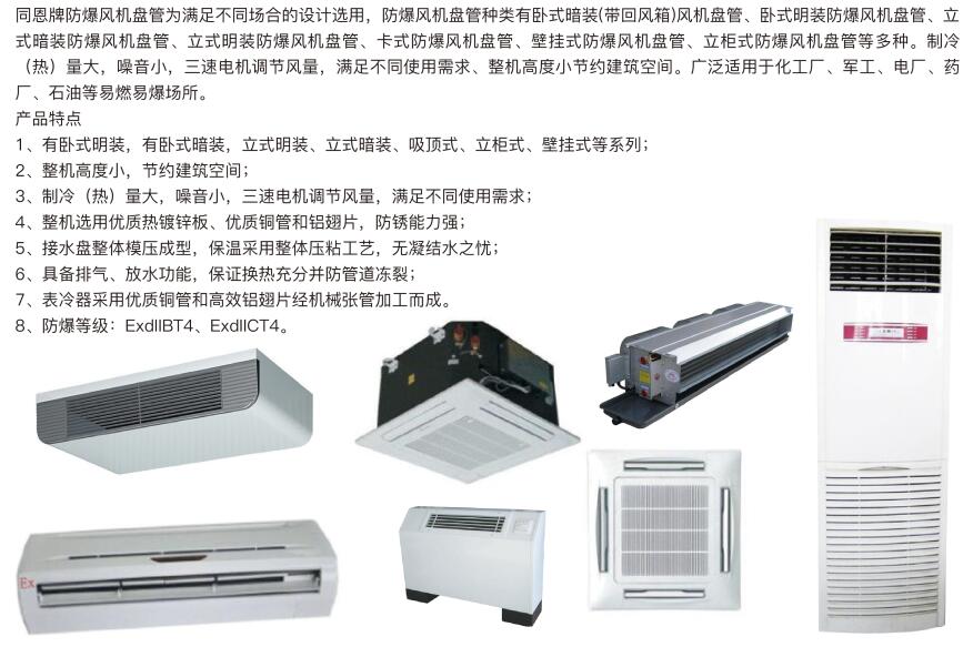 臥式暗裝防爆風機盤管主要由風機、換熱盤管和機殼組成,按風機盤管機外靜壓可分為標準型和高靜壓型、按換熱盤管排數可分為兩排和三排,換熱盤管一般是采用銅管串鋁翅片。