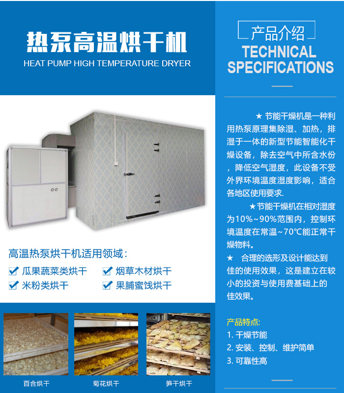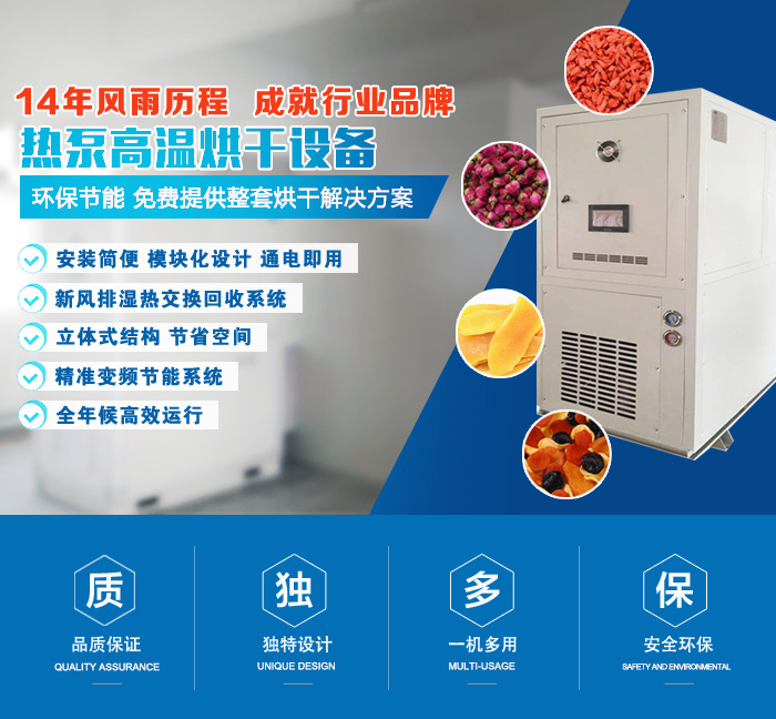 同恩牌熱泵干燥機采用谷輪或大金壓縮機,采用熱泵技術,節能脫水,使得干燥效率大大提高,特別是在高溫狀況下干燥物料,有很高的能效比